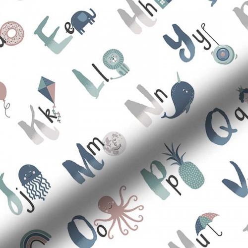 ABC Characters is a blackout fabric that features the alphabet with relating pictures, ideal for children's rooms.
