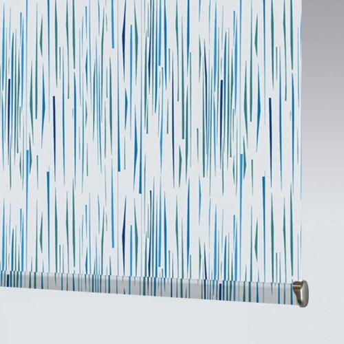 Nautical Aqua features a blue and green broken line design on a white background, perfect for bathroom's due to its PVC waterproof Blackout qualities.