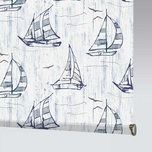 Sailboat bathroom or childrens fabric? Suitable for both, a multi boat hand drawn print on a pvc fabric, totally waterproof and flame retardant.